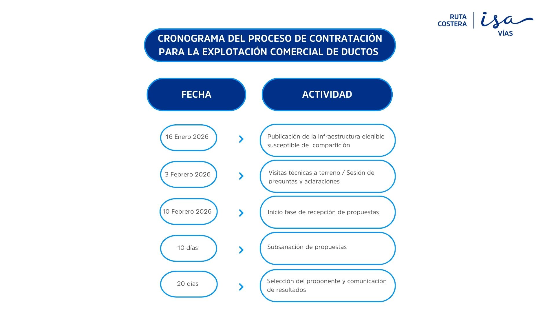 Invitamos a las empresas del sector de telecomunicaciones a consultar los términos y condiciones y el cronograma del proceso, y a presentar sus propuestas alineadas a los requisitos establecidos, a través del correo  contacto@rutacostera.co a partir del 10 de febrero de 2026.